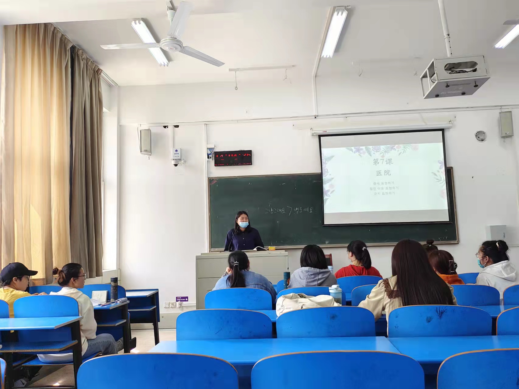 据听课学生讲,本课程已经开课6周,今天的主题是“医院”。阴宝娜老师让同学们跟读和医院相关的韩国语单词,她将这些单词分为“身体部分、形容词、其他、词语搭配”等四类。每讲一个单词,阴宝娜老师都为大家作详尽的解释,并说出它们在各种语境下的不同写法,同学们也积极参与讨论。语言承载文化,文化反过来影响语言的使用。阴宝娜老师说,韩国人对待饮食的态度与中国人不一样,比如韩国家长只要认为某种食物对孩子身体没什么影响,那都是可以吃的;而中国家长会给小孩子灌输饮食红线,这个能吃,那个不能吃。中国家长教育子女要多喝热水,少喝凉水;而韩国家长会让孩子多喝温水。讲到与疾病有关的词汇,阴宝娜老师对中国人感冒后所采取的诊疗措施产生了浓厚的兴趣,同学们告诉她,中国人感冒后可能更习惯于多喝热水,如果疾病加重,可能会吃中药、输液。同学们开玩笑地说,中国的医生会针对不同年龄的患者开出味道不同的药物,他们会让小孩子吃一些带有甜味的药。这种说法引发了同学们的哄堂大笑,阴宝娜老师也笑得合不拢嘴。