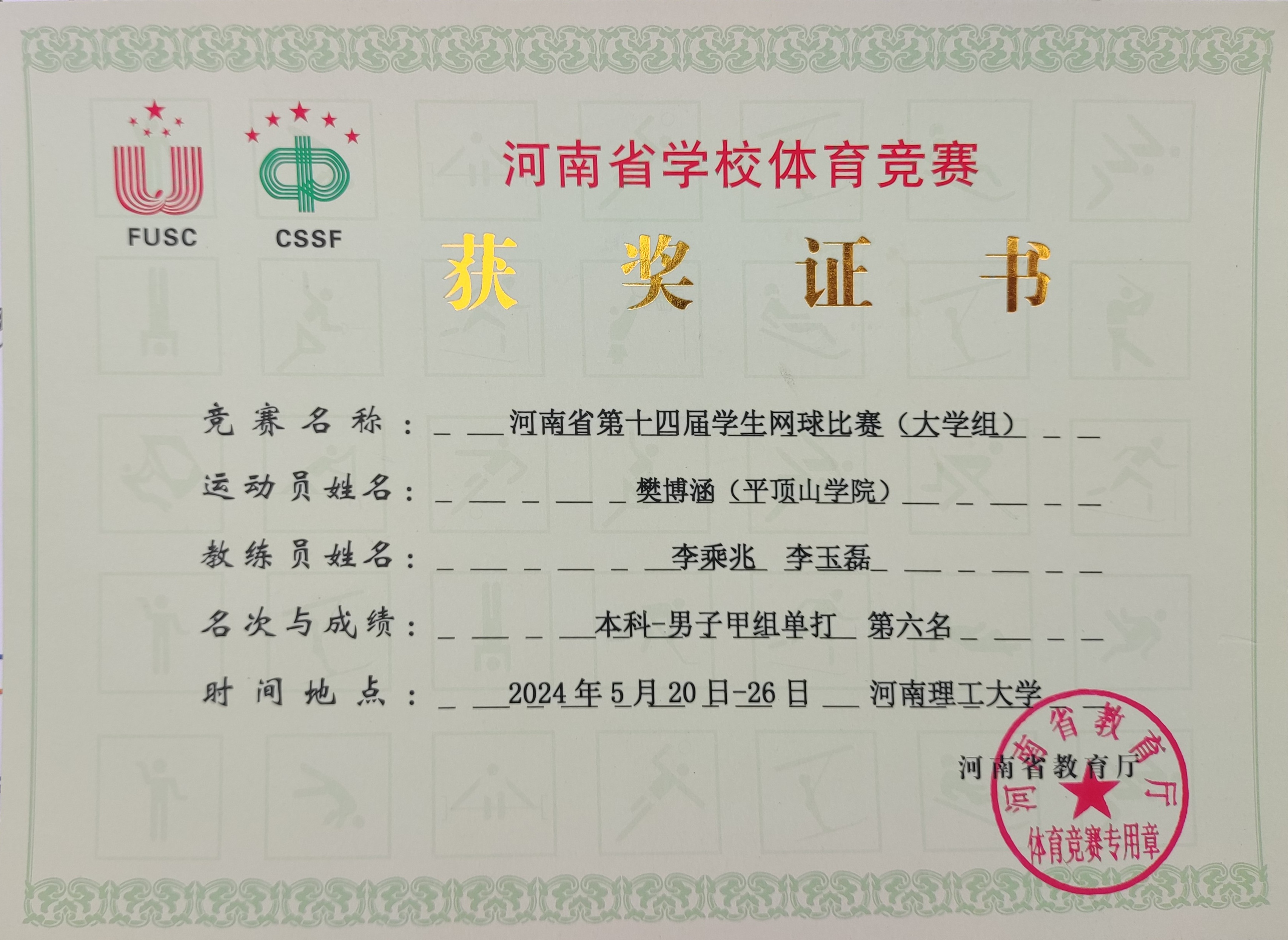 5月26日,河南省第十四届学生网球比赛在河南理工大学落幕。WilliamHill体育2020级汉语言文学专业学生樊博涵参赛,获得大学组第六名。