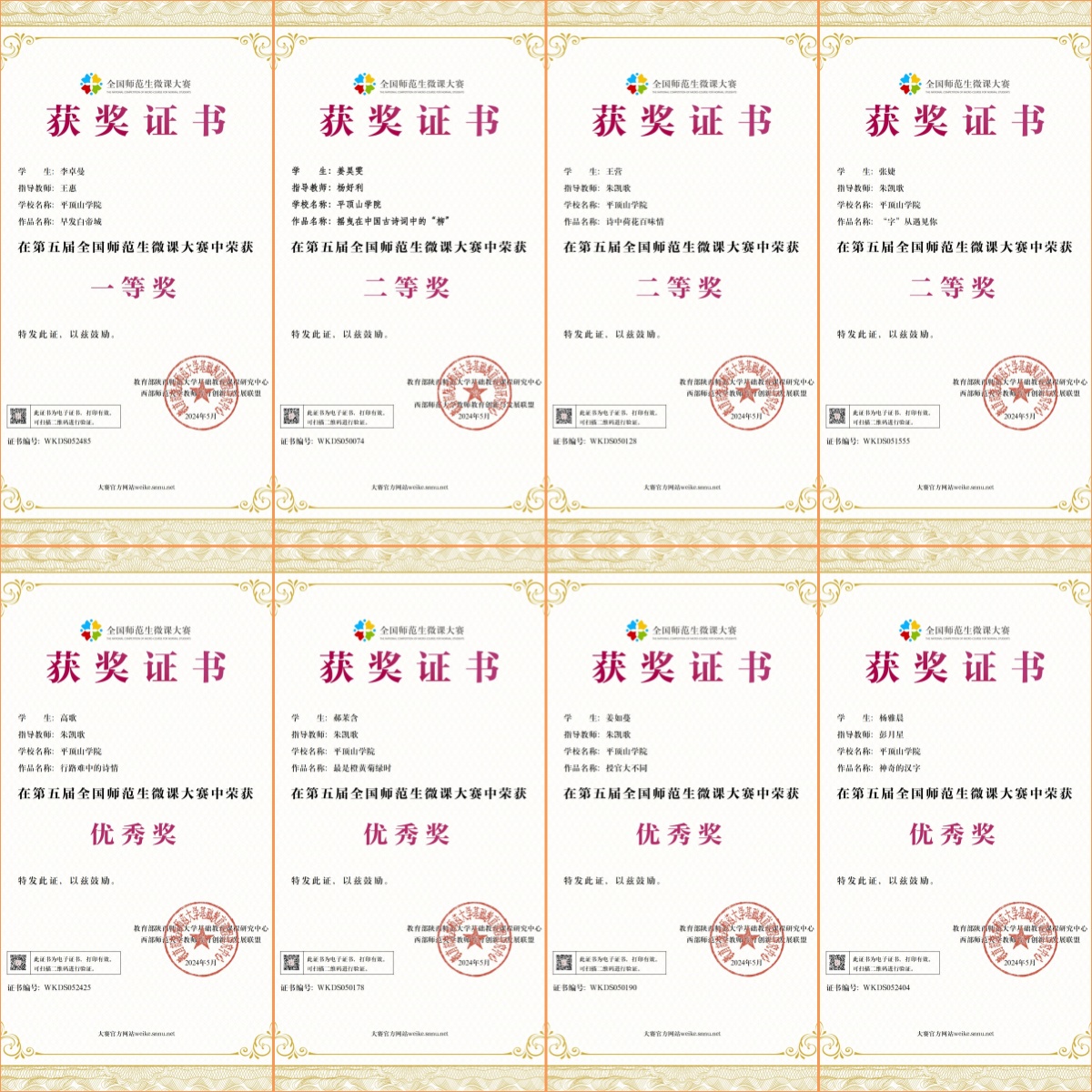 近日,第五届全国师范生微课大赛获奖名单揭晓,WilliamHill体育2021级汉语言文学专业李卓曼获一等奖,姜昊雯、王营、张婕获二等奖,高歌、郝茉含、姜如蔓、杨雅晨获优秀奖,指导老师为朱凯歌、彭月星、王惠、杨好利。
