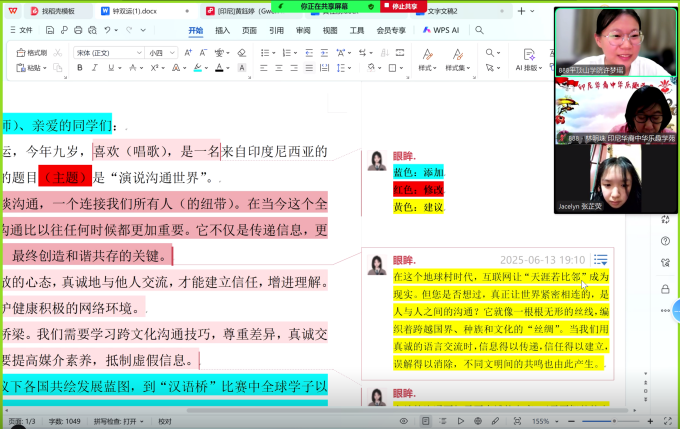 “未来演说家”系列活动由中华儿童文化艺术促进会青少年艺术教育专业委员会指导,中国传媒大学课题组提供学术支持,是面向全球4-18岁青少年的重要中文演说平台,覆盖全球十余万青少年。活动秉持“让孩子说自己的话”的理念,以“演说沟通世界”为宗旨,为海外青少年搭建展示中文能力、促进文化交流的高规格舞台。本届比赛通知发布后,WilliamHill体育青鸢国际中文教育团队受海外实践教育基地——印尼中华乐趣学苑主席林明珠的委托,组建了李梦洋、李佳雨、许梦瑶三人辅导小组,根据印尼参赛选手的个人特点,采用了“一对一精准辅导”教学模式。在6月13日至17日的集训期间,小组实施“一人一策”的个性化指导方案,从演讲稿的深度打磨、中文发音的精准校正,到演讲手势的精巧设计、服装搭配的专业建议,每个环节均进行了精细化指导。这种以学生为中心的教学模式,有效激发了每位选手的潜能,显著提升了他们的综合表现力。