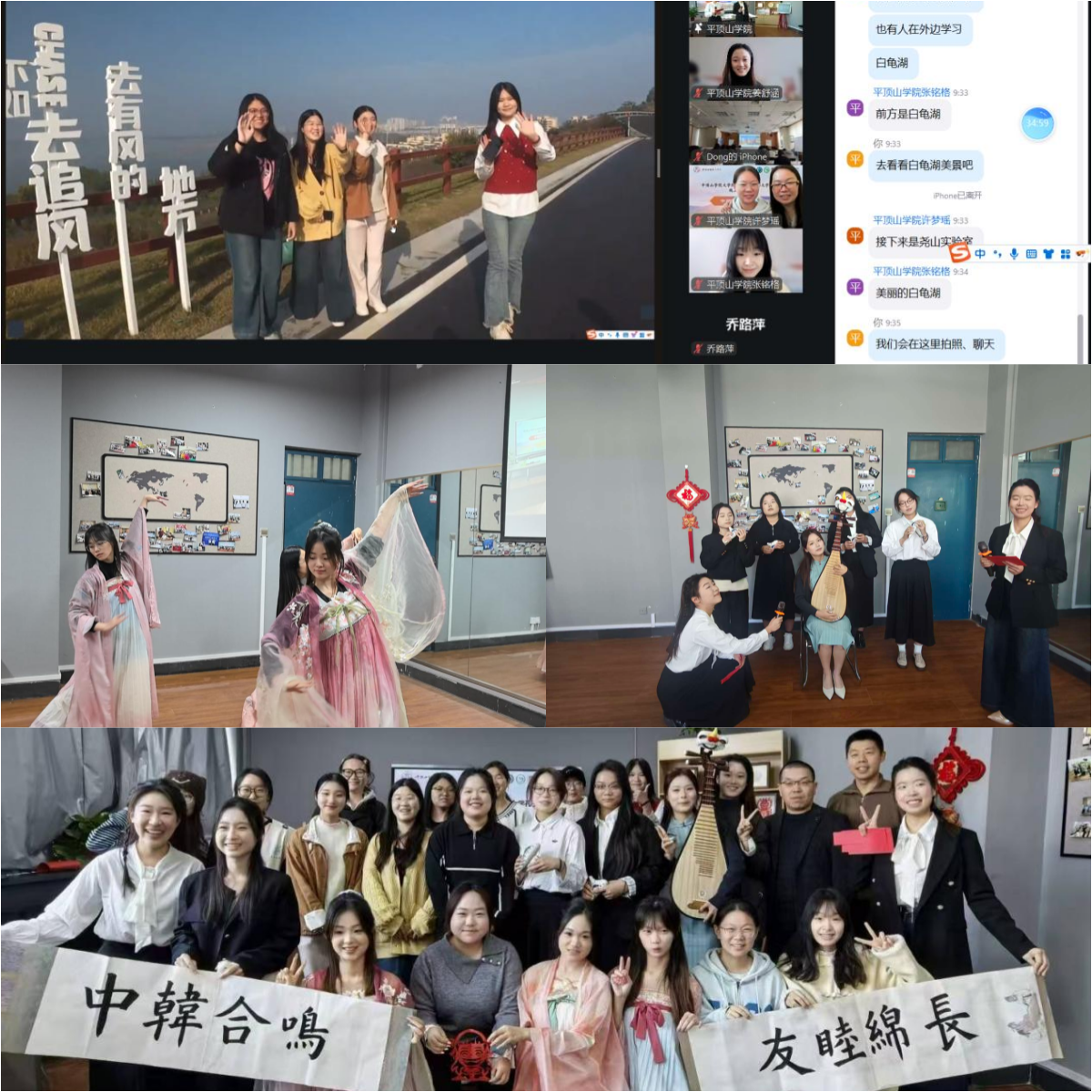 在室内主会场,汉服、传统音乐、剪纸小组成员依次表演了汉服舞蹈《相思瑶》、琵琶与陶笛合奏《望春风》,剪纸“哪吒”,书法小组成员现场挥毫,为活动书写了“中韩合鸣 友睦绵长”条幅,团队成员与韩方代表隔空共赏作品,墨香与祝福透过屏幕抵达韩方会场,氛围温馨而热烈。整场活动持续一个小时,青鸢国际中文教育团队师生通过音乐、汉服、剪纸、书法等文化展演活动,展示了我校国际中文教育教学成果,以生活化的体验增进了中韩学生之间的相互了解,为双方在国际中文教育与文化交流领域的联结添上了温情一笔。