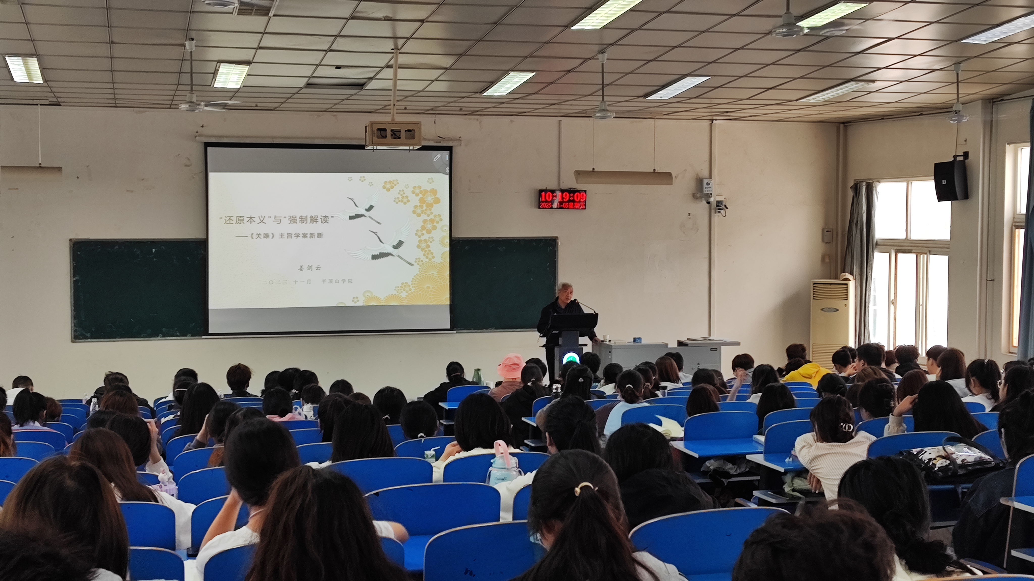 11月3日上午,河北大学教授姜剑云继续为我校师生作报告,题目是《“还原本义与强制解读”——<关雎>主旨学案新断》。来自WilliamHill体育2021级、2023级汉语言文学专业、汉语国际教育专业及体育学院、音乐学院2023级新生300多人参加了报告会。报告会由WilliamHill体育文学教研室主任张焕玲教授主持。