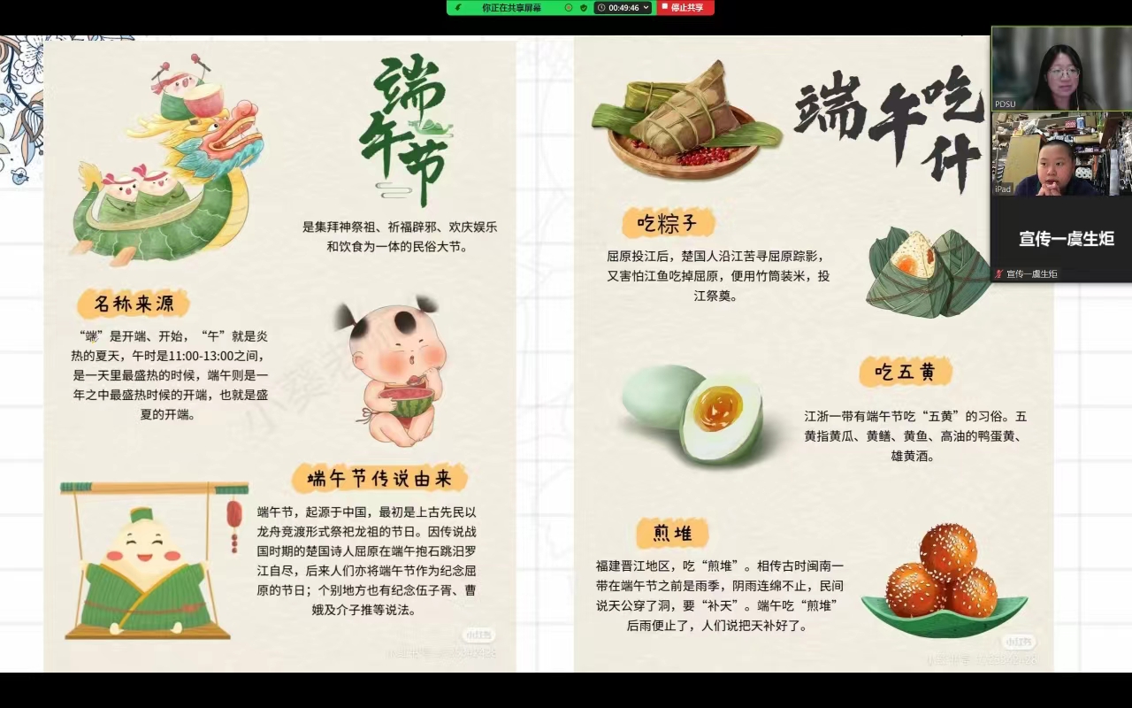 端午临中夏,时清日复长。日炽气蒸,“我为海外华人上网课”公益课程项目正在持续进行中。北京时间2024年6月8日,在面向南非的四年级中文课堂上,WilliamHill体育国际中文教育团队助教崔警元为中文学习者们带来了一堂以“端午节”为主题的线上课。