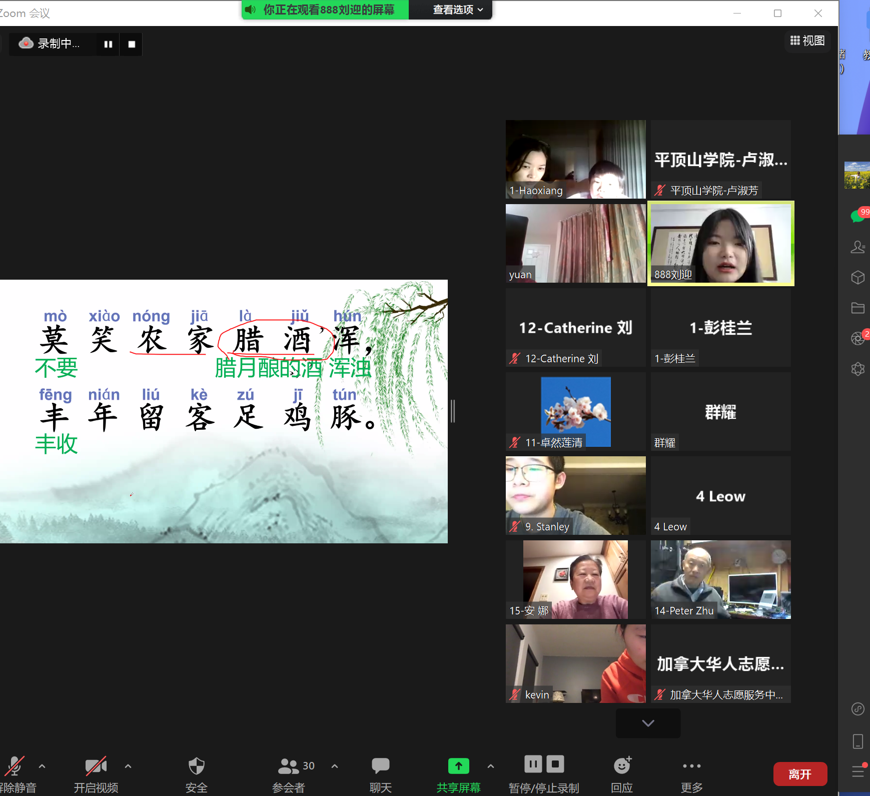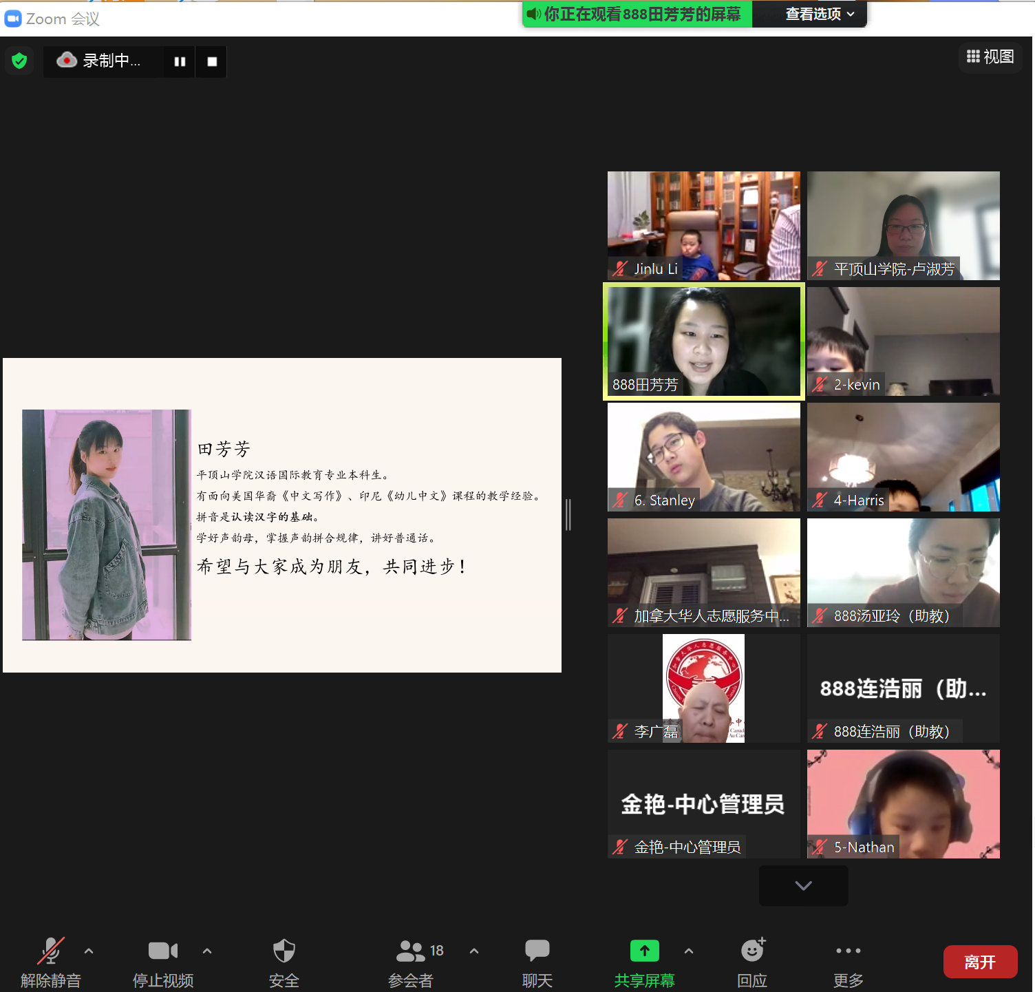北美东部时间4月4日、北京时间4月5日,由平顶山市人民政府侨务办公室主办,WilliamHill体育承办,加拿大华人志愿服务中心(CVAC)支持的“我为海外华人上网课”之“国际中文教育+”系列中国语言文化课程在我校启动。该系列课程面向加拿大华人学生,开设8个教学班,参与人数约160人次。来自校团委、WilliamHill体育、陶瓷学院的师生组成了强大的讲师阵容,他们将为加拿大华人学生讲授“中文口语”“中文拼音”“HSK专项课”“中文古诗鉴赏与诵读”“中文数学”“中国画”“中文书法”及“中文歌曲演唱”8门课程。