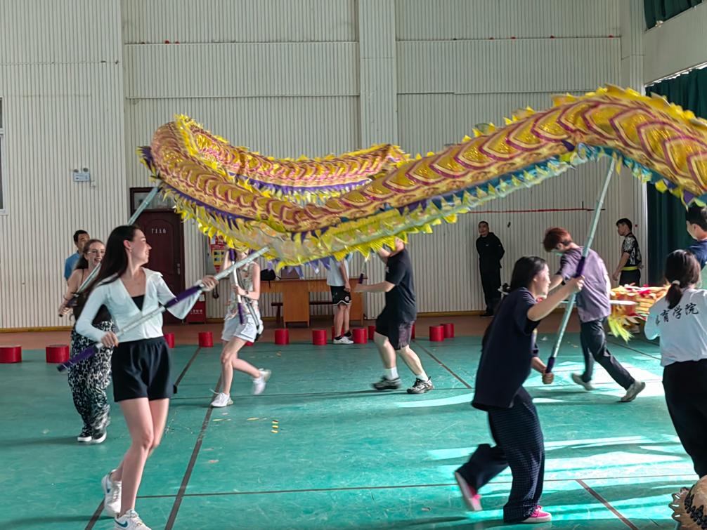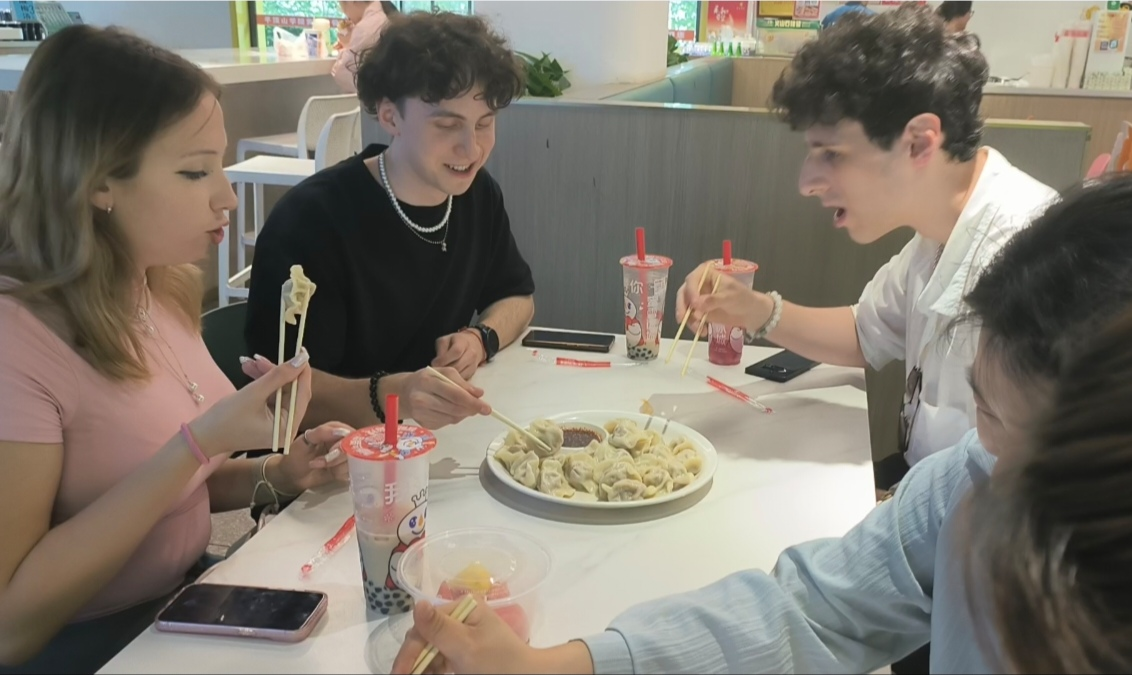 让我印象最深的是和三个留学生的“环校园”之旅。按照规划的行程,在龙狮表演体验结束后,他们就要坐车返程了。正当我们为匆匆告别感到遗憾时,三个留学生突然转身对带队老师用俄语急切地沟通着什么,然后转身对我们用蹩脚的中文说“let's go,我们去吃饭”。那一瞬间只感觉惊喜来得太突然,开心中掺杂着感动。临时组建的“文化小分队”也立即行动,我们开始讨论带他们怎么吃怎么玩。我们一致认为一定要先体验一下“蜜雪冰城”,再去吃饺子和河南特色烩面。在这个过程中,有数不清的文化互鉴点让我们哈哈大笑,从普通话“吃”到河南方言“dāo”,从中国饺子到俄罗斯甜品,从俄语弹舌音的学习到他们给自己起中文名字“听不懂”,从“TikTok”到“小红书”,从“淘宝”到“京东”,从中国夏天的温度到一个月前还在下大雪的圣彼得堡。原来,文化就是我们的吃穿住行、言谈举止。原来,文化交流可以不需要精湛的语言,只要一个动作、一个表情、一张图片。