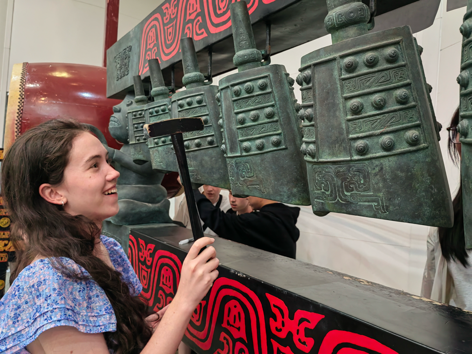 短短半天的文化交流让我知道,原来俄罗斯的房子也不都是尖尖的屋顶,原来夏天的圣彼得堡也会热得冒汗。更让我惊喜的是,跨越八千公里的俄罗斯餐桌也摆着相似的温暖,用Dima的话来说,他们的美食就是“俄罗斯面条、俄罗斯米饭和俄罗斯饺子”。那些关于北极“冰雪王国”的刻板印象突然碎成泡沫。当我们并肩站在龙狮翻腾的热闹情景下,当编钟的余韵在他们眼睛里泛起激动的光,蜜雪冰城的吸管传递着“中国特色”的甜,青铜编钟震颤着“千年古典”的美,平仄起伏的中国话展现着“无与伦比”的韵味。此刻,我终于懂得:所谓文化自信,不是固守传统的孤岛,而是让古筝与手风琴在夏风中共鸣。