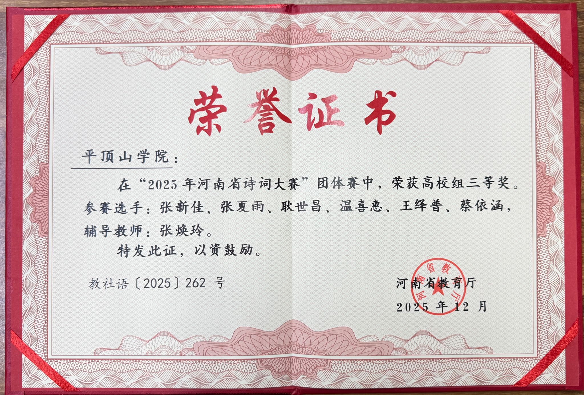WilliamHill体育——2025年河南省诗词大赛团体赛三等奖